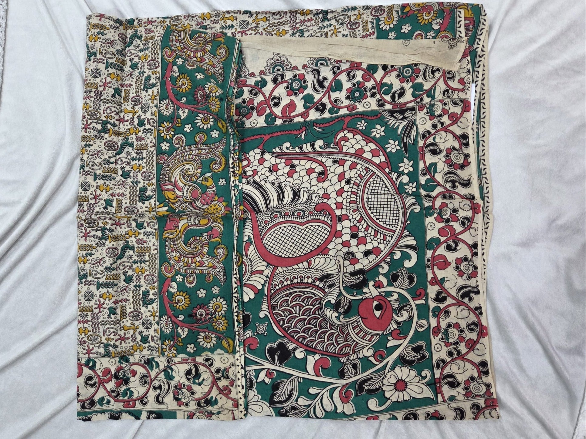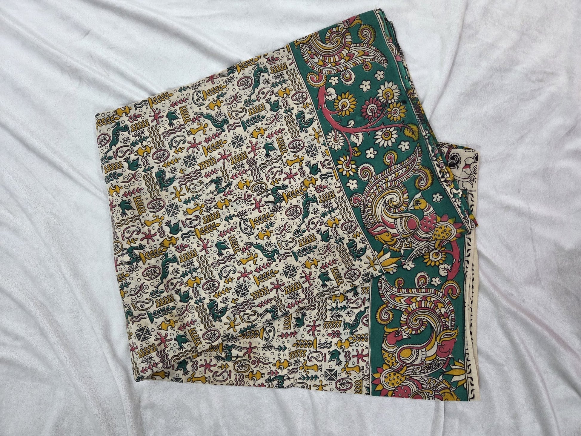 Experience the timeless elegance of this Kalamkari cotton saree, adorned with intricate floral and vine motifs. Crafted using traditional hand-painting techniques, the breathable cotton fabric ensures comfort while showcasing artistic detail. Ideal for both casual and festive occasions, it combines heritage craftsmanship with everyday wearability for a sophisticated look.
