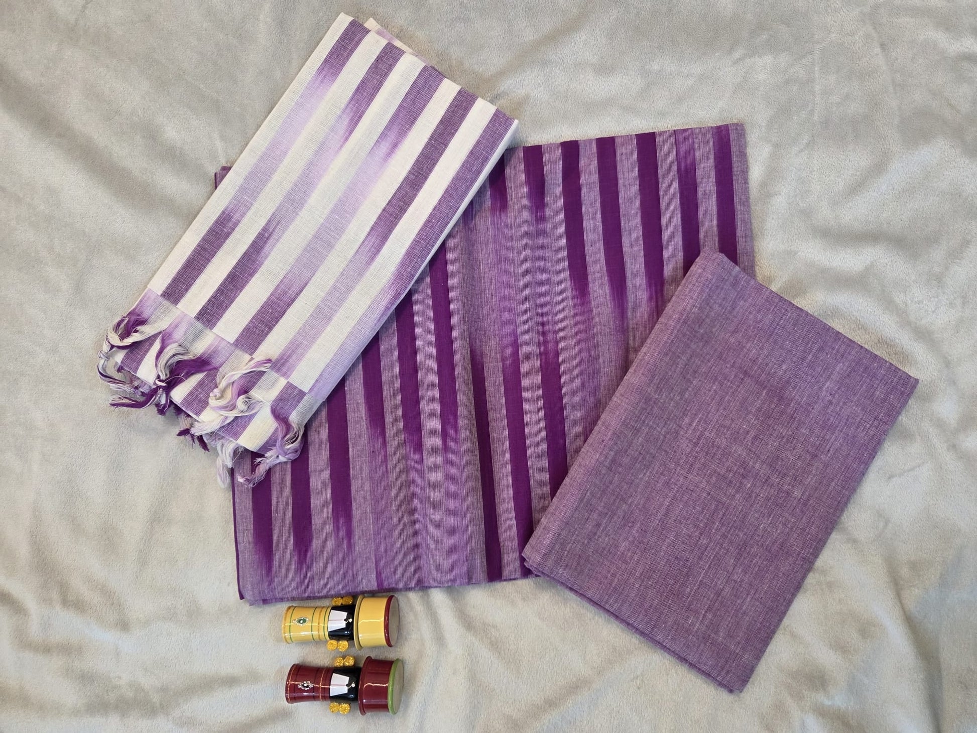 This Pure Mangalagiri Cotton Ikkath Lines dress material set includes a 2.5-meter top, a 2-meter bottom, and a 2.3-meter dupatta. Renowned for its breathable, high-quality cotton, the fabric features traditional Ikkath lines that combine durability with elegant design. Perfect for crafting sophisticated, comfortable attire, this set exemplifies expert tailoring potential with authentic textile artistry.