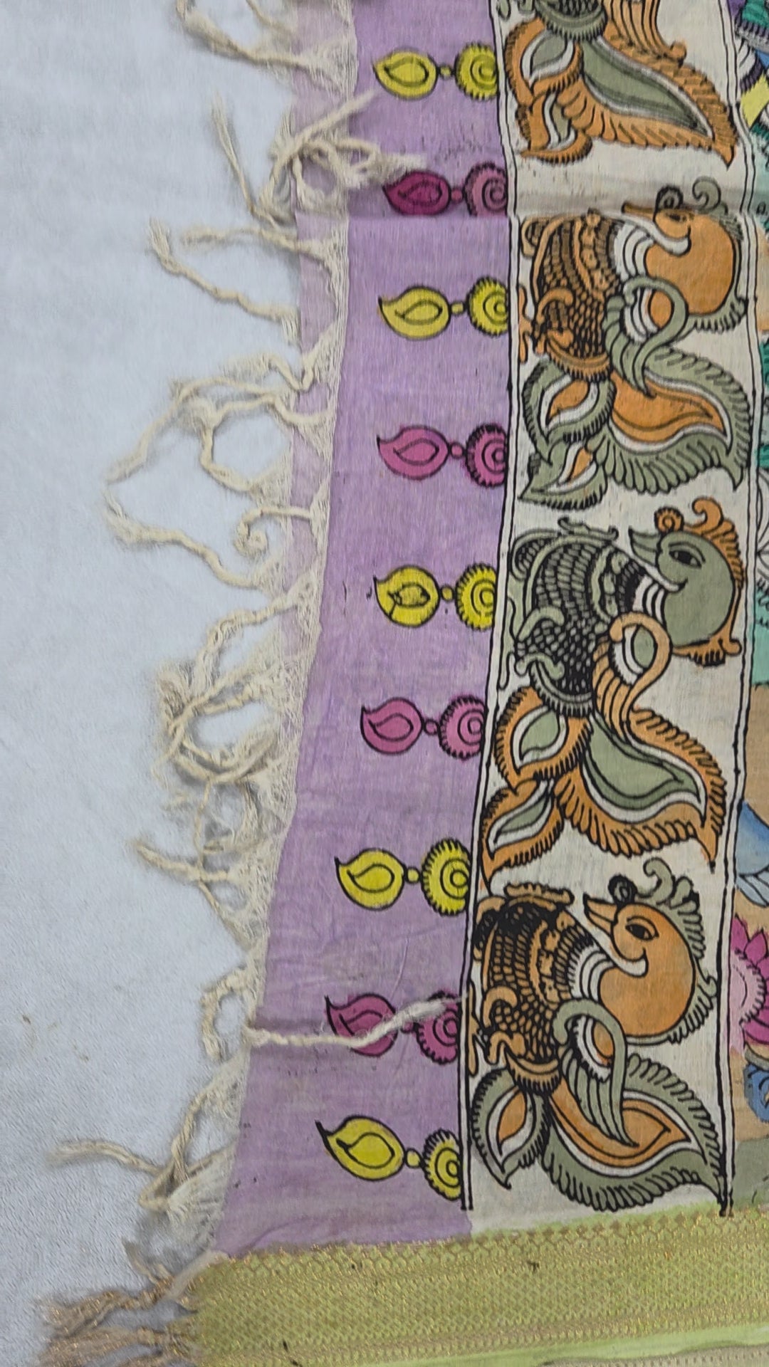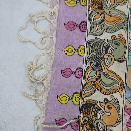 Elevate your ethnic collection with the Radha Krishna Pen Kalamkaari Dupatta crafted from breathable cotton. This exquisite piece showcases intricate Kalamkaari artistry depicting Radha and Krishna with fine pen work, reflecting traditional craftsmanship. Its lightweight cotton fabric ensures comfort, making it perfect for day-long wear while adding a spiritual and artistic touch to your ensemble. Ideal for pairing with both casual and festive attire, this dupatta brings timeless elegance and cultural depth to your wardrobe.